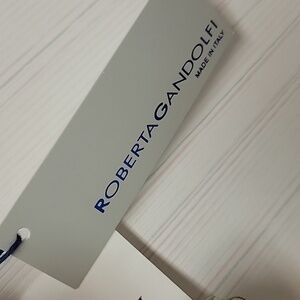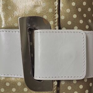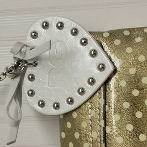 Stylish polka dot clutch with a chic chain strap from Roberta Gandolfi. made in Italy. gold and white. 11.5" wide, 5.5" high, 1" deep. black marks on bag, (pictured). looks like in transfer from newsprint. I did not try to clean. New with tags