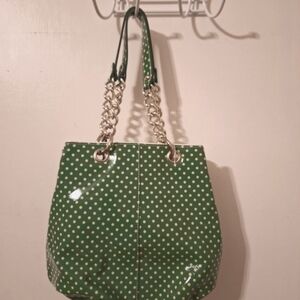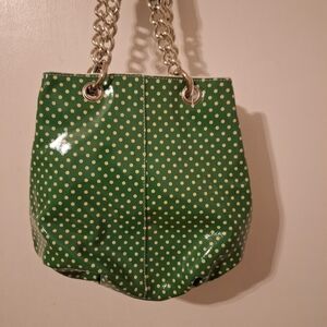 green and white leather Polka Dot bag with a white leather bow and silver chain hardware. good condition