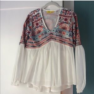 Beautiful colors and gorgeous flow. Very flattering. Beautiful embroidery with colorful detail. Worn a few times but you can’t tell… No stains!