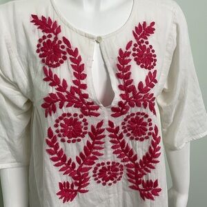 Loose fit white cotton with bright pink embroidery down front. Tiny mark on sleeve