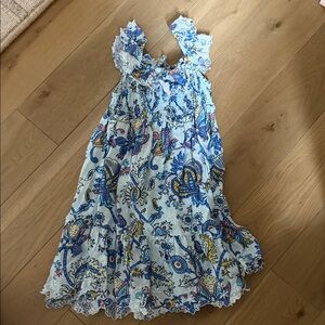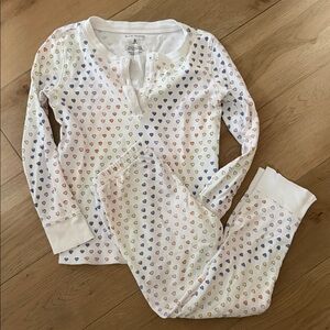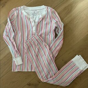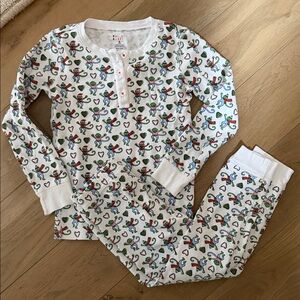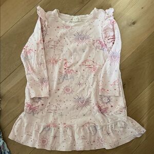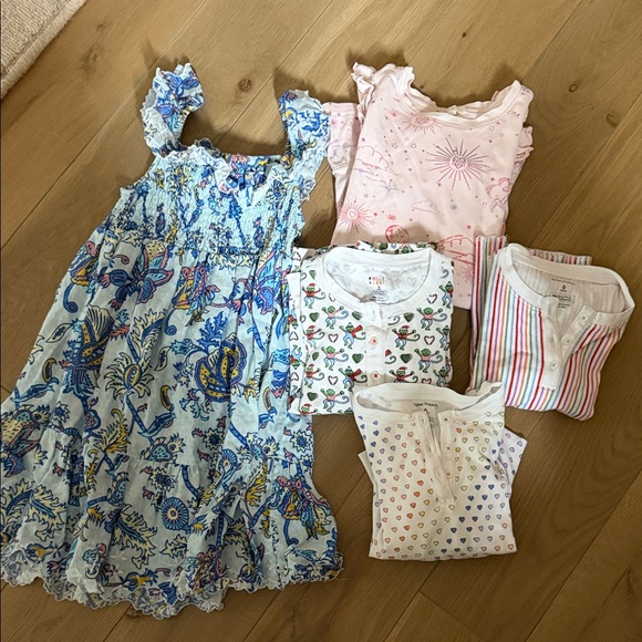 Bundle of size 6 items: 1 floral dress, 1 pink night gown, and 3 pajama sets (disco hearts, Christmas monkeys, stripes). Good condition. No holes or stains.