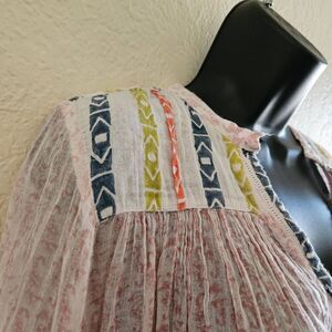 This is a long sleeved cover-up tunic by Roberta Roller Rabbit. It is white and pink with earth tone geometric details on the shoulders and multicolored tassels around the hem. Note that this tunic is slightly longer in the back than in the front.