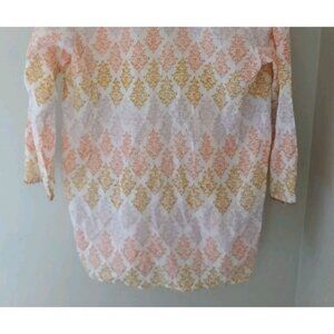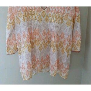 Roberta Roller Rabbit Kurta Top. Size Small. Yellow Floral Block Print. 3/4 Sleeve with beads on the cuffs. 100% cotton. In excellent, preowned condition with no flaws. Measures approximately 20" pit to pit, 28" shoulder to hem.