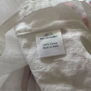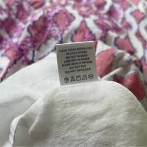 Medium. Gorgeous printed tunic style dress from Roberta Roller Rabbit. Versatile piece works as a tunic, coverup, or dress and features short sleeves, split neck, relaxed slim fit through body. Hand block printed cotton in pink, blue, and white boho tile print, accented with pretty pink embroidery around neckline and hem (embroidery thread has a subtle hint of sparkle). Lightweight and airy 100% cotton is dreamy for warm weather, beach, pool, tropical vacations. This is giving major White Lotus vibes, perfect for swanning around a stunning