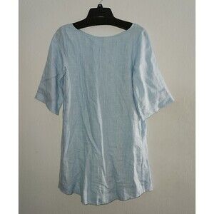 This Roberta Roller Rabbit tunic shift dress is a versatile piece, perfect for any occasion. The dress is made of lightweight linen material in a pastel light blue color, with a solid pattern and collarless design. It features 3/4 sleeves, a round neckline, and convenient pockets for your essentials.