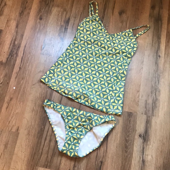 So cute, NWOT, RRR tankini. The model is Freddy Set Kalei and is green, hello, white, and black. The bottom is fully lined with the hygienic liner attached. The top is lined, not padded. The straps are adjustable.