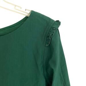 Roberta Roller Rabbit solid emerald green long sleeve ruffle shoulder dress. Features beautiful a-line pleating at back, ruffle detail on shoulders. Would be a nice Holiday occasion dress!