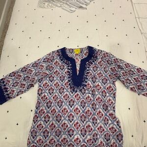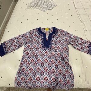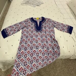 This is a brand new never worn, but without tags, Robert Roller Rabbit colorful yet classy and sophisticated Tunic. You can where thrice with you capris and stilettos, you can where it with white jeans and flats, or you can where it over you bathing suit fit a high end swim party. The bottom line is that it’s brand new, it’s a conversation piece, and I am offering it at a great price.