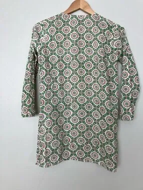 This tunic by Roberta Roller Rabbit in floral print in green and pink.is 100 percent cotton. The flat measurement from the armpit to the armpit is 19.5” and the length is 28”. The tunic is in fair condition because of the loose stitching under both armpits and can be seen in the pictures. The price reflects this.Lightweight woven fabric. Round neckline. Cap sleeves. Playful, casual style.