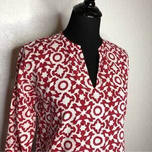 Roberta Roller Rabbit red and white geometric print tunic top. Pullover style with mock collar and v notched neckline. Semi see through lightweight material. Black trim on hemline and sleeve cuffs. Side slit hemline. Size Small. Very good preowned condition. Minor frayed spot on neckline as shown.