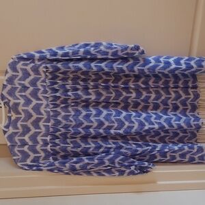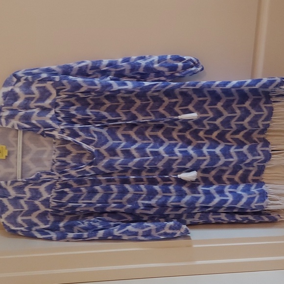 Roller Rabbit printed tunic top in a lightweight sheer fabric with fringe bottom 3/4 length sleeves. Great over a tank or as a coverup