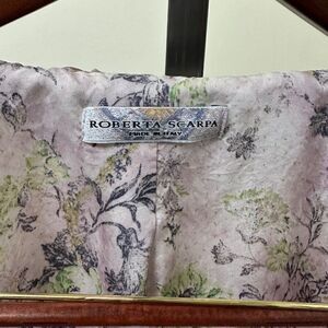 Stylish and chic Roberta Scarpa lightweight jacket with zip front, ruffle trim, and belt. Perfect for layering on cooler days.