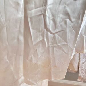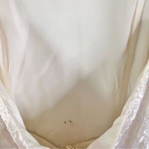 Has some staining at underarm and a few stains on the overlay skirt, not very noticeable imo. There is also a mark on the interior as shown in pic. May come out, have not treated.