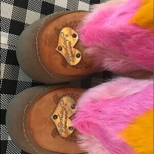 Fur has heart shape on front and gold heart label on toe Robert Cavalli Angels logo
