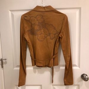 This Roberto Cavall belted leather jacket is in brand new condition and comes from a smoke/pet-free home. It is 100% soft leather, made in Italy, with a beautiful rose cutout on the back. Size small.