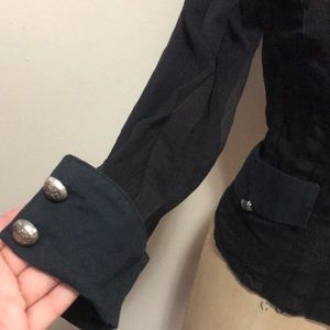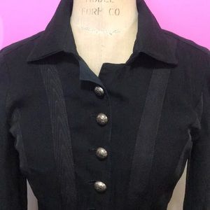 This unique jacket by Roberto Cavalli has boning inside as well as a military inspired style. Cuffs are of a different material. One cuff needs to be tacked back. Pair with skinny pants and ankle boots for a finished look.