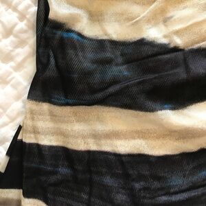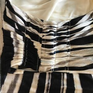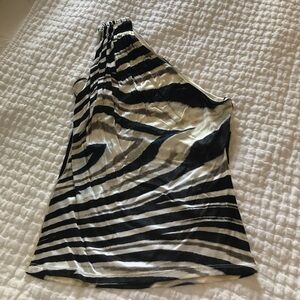 Stylish one-shoulder top. Features bold black and cream stripes. Perfect for a chic look.