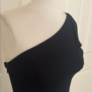 Chic black dress with elegant lace accents. Ideal for sophisticated occasions. Measurements are length 63 sleeve 26. Waist 22 this dress has stretch to it and a zipper on the side brand new.