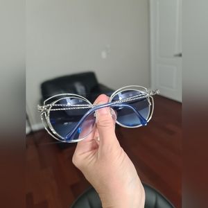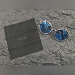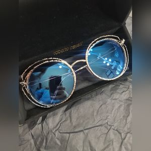 Chic Roberto Cavalli sunglasses with blue lenses. Silver frames add elegance. Ideal for sunny days.