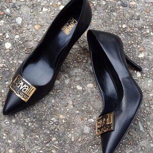 Roberto Cavalli Class Black Leather Pumps Gold Buckle 3″ Stiletto Size 5 NWOT