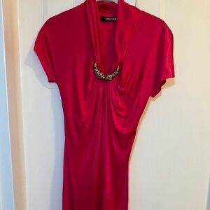 The stunning cowl neckline, adorned with an exquisite embellished detail, adds a touch of glamour, making this dress perfect for exclusive soirées, cocktail events, or a high-profile night out. Designed with Cavalli’s signature flair for femininity and sensuality, this dress is both bold and timeless.