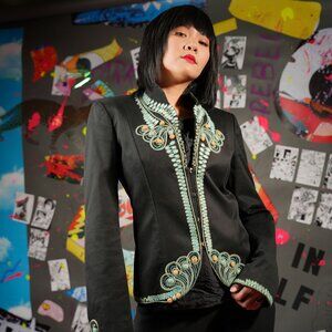 Love a little retro flair with your sophistication? This gorgeous 2007 Roberto Cavalli jacket brings together bold embroidery, timeless tailoring, and just the right touch of global inspiration.