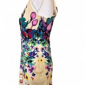 floral print, bodycon fit, midi length, silk-lined, curve-hugging, bold pattern, feminine style, elegant dress, statement piece, stretchy viscose