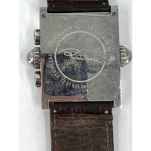 *signs of wear and spot on leather and scratches on steel surfaces, noted in photos. Needs watch battery but works.