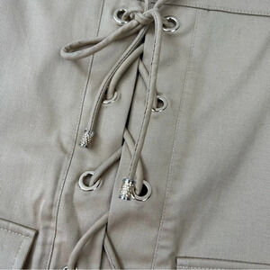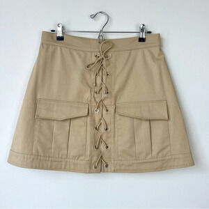 Roberto Cavalli Lace Up Cargo Mini Skirt Tan. a few tiny marks, shown in pics, and the clasp in the back needs reinforcement with thread. high quality piece!
