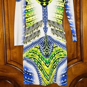 Roberto Cavalli long-sleeve bodycon mini dress in off-white, black, apple, lime, and yellow. Cut outs on shoulder. Perfect preloved condition, no rips, tears or stains.