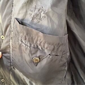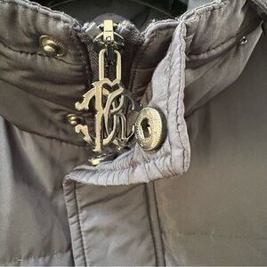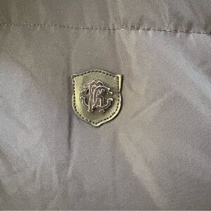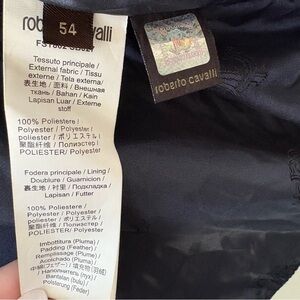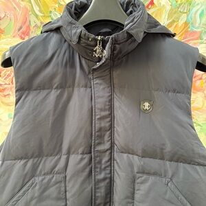 Designer Roberto Cavalli navy blue puffer vest with hood.