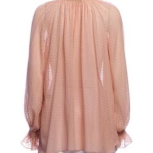 New with tags Roberto Cavalli ruffle-trimmed silk-georgette blouse in color blush. V-neck style and tassel accents.Size small US4 IT40. Bust : 42" / Waist : 44" / Length : 25.5". Fabric is 100 % silk.