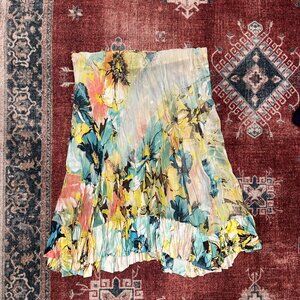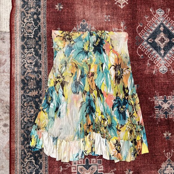 Vintage Y2k Roberto Cavalli 100% silk skirt with multicolor tropical / floral print and gold accents on the silk to make the flowers shine. The main body of the skirt is a beautiful and soft semi-sheer skirt with a non-sheer ruffle at the hem, it moves beautifully. The pleats are an intentional design and are not meant to be ironed out.