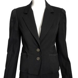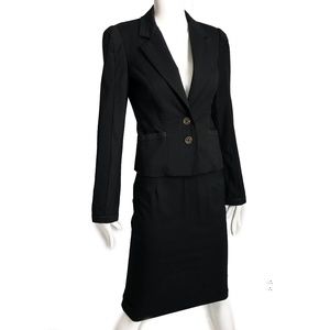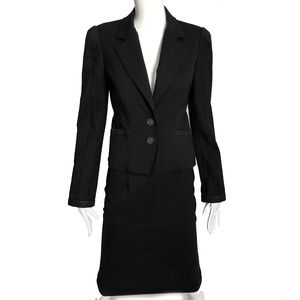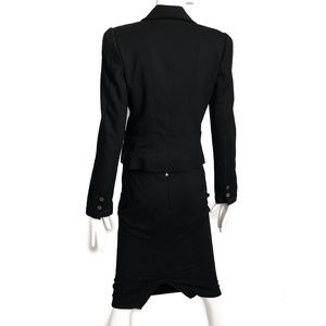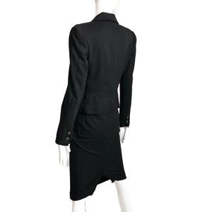 Authentic, preowned Roberto Cavalli 2pc Power Suit Jacket & Skirt size 40. Unlined/slightly stretchy wool & spandex blend fabric/dry clean only. Decorative panel at side of skirt & jacket pockets/fits to hug your curves. Preowned with minimal signs of prior wear. Tagged size 40. Jacket: shoulders - 15.5in, bust - 34in, waist - 27in, shoulder to hem - 20in, sleeves - 22in. Skirt: waist - 27in, hips - 37in, length - 26in.