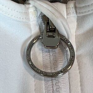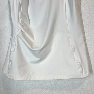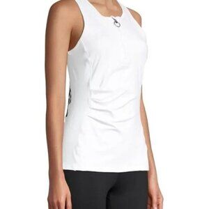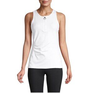 Breathable mesh at back, stylish right side ruching, and zipper pull silvertone logo ring. Pullover style