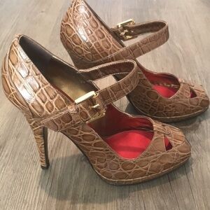 Peep toe heels with red interior lining. Adjustable ankle closure.