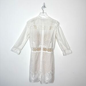 Elegant white lace dress with cream slip and three quarter sleeves . Features intricate patterns and a tie waist. Featuring eyelet and embroidered accents, three quarter sleeve with button front top closure and waist tie. Great for summer, bachelorette party or for a bride to be at a rehearsal dinner!