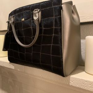 Multiple sections in bag with a gold and leather I.D front is mink alligator print