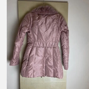 Very good condition Cavalli Silk Coat with Real Goose Down and Mink Fur in Natural Pearl Color Light Gold Zip. bust 39 in waist 35 in, length 32 in