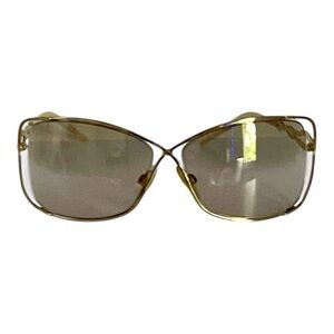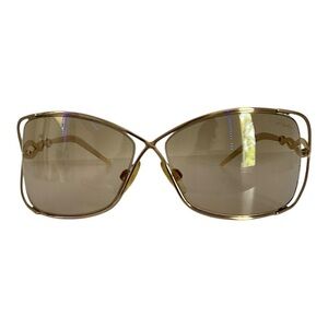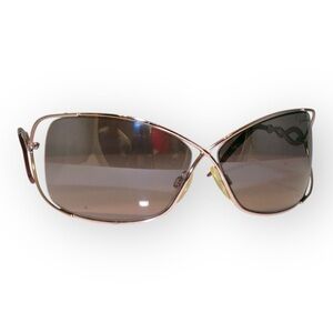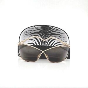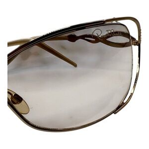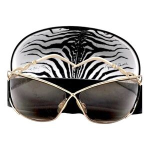 Roberto Cavalli sunglasses. Features a gold frame with intricate design. Stylish and chic for any occasion.