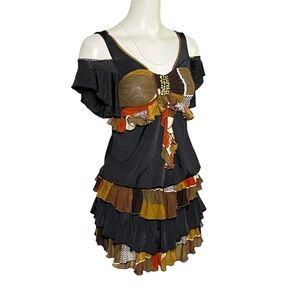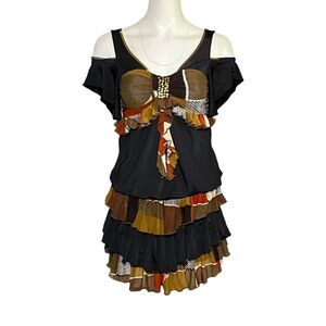 Roberto Just Cavalli Y2K Patchwork Ruffle Tiered Cold Shoulder Mini Dress Size M