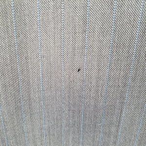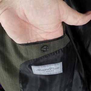 Roberto Villini jacket 100% wool. cklassic blazer in brown with lt blue pinstripes. collar and lapels. long button cuff sleeves. three button front. one top/two bottom flap pockets on outside and 4 inside pockets. sharp looking jacket.