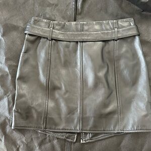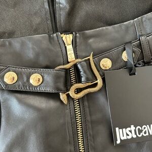 Sleek leather skirt by Just Cavalli. Features gold buckle and zipper.