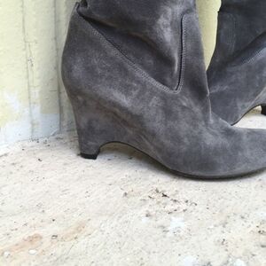 Beautiful gray to the knee suede boots, in very good condition slight wedge style heel. Soles have wear but not bad. Heel is 2 3/4