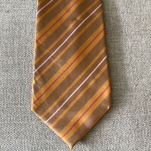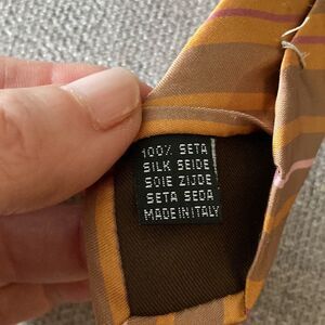 Roberto Fino silk tie in burnt orange with tan, red and pink diagonal strip. Matching keeper and brown silk lining. Made in Italy.