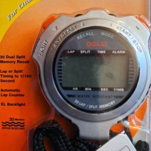 Robic 30 Lap Memory Stopwatch Silver. New in retail blister pack. Interested, make an offer. From a smoke and pet hair free home. Fast shipping. From the maker: 30 dual split memory recall; 1/100 second precision to 10 hours, Lap, split or dual split timing options; automatic lap counter to 99, Time of day, alarm, and calendar functions, Total Memory Recall indicates that the Robic stopwatch allows you to review previous readings without interrupting current timing. Most others require you to exit the stopwatch mode and use a "Memory" mode to access previous readings. Breakaway Safety Lanyards, Water Resistant to 30 meters. Over-sized pushbuttons