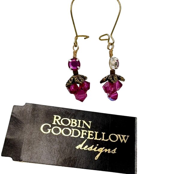 These handcrafted earrings by Robin Goodfellow Designs offer an elegant aesthetic with Fuschia Pink Crystals and gold-plated earwires. Their nature-inspired design and fine craftsmanship make them a sophisticated choice for those who appreciate unique and stylish jewelry.