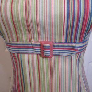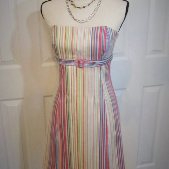 Halter-style strapless sundress. Cool cotton fabric with a bit of stretchy spandex for comfort. Partially lined at top. Can be dressed up or down. Attached belt, empire waist. Back zip. Made in USA.