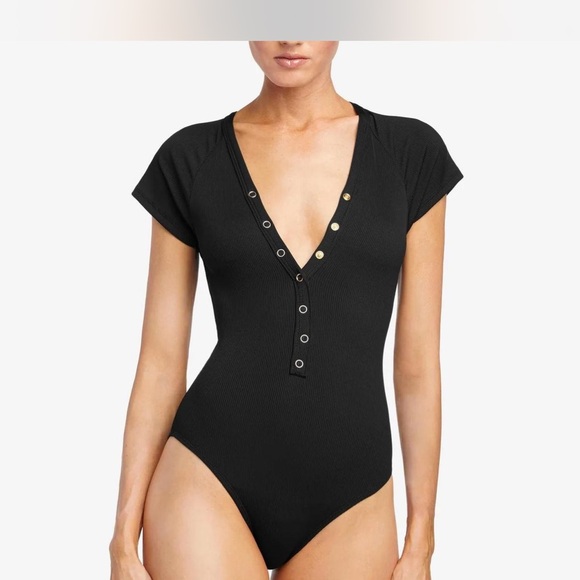 Super flattering ribbed one piece with cap sleeves, v-neck, and open back. Gold clasp detailing and adjustable tie at the back.