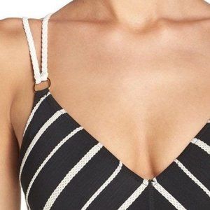 Robin Piccone 'Harper' Chevron One Piece Swimsuit in Black/White Size 12. In excellent condition. Features a v-neckline, chevron striped pattern throughout, an open back design with lace-up/criss-cross back straps, built in shelf bra with removable padding, and moderate seat/bottom coverage. Questions? Feel free to ask, drop me a comment below.